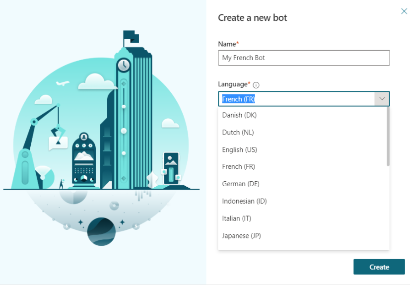 How to create multi-language Bot : Basically you need to create a new Bot for each of the language which you want to provide support for example your customer base speaks French , English & German , so you will need to create 3 separate Bot for each of the languages.