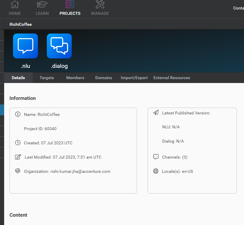 To create a new Dialog, Login on to Nuance Mix Dashboard, from the navigation area select the Project RichiCoffee and click on dialog icon as show below.