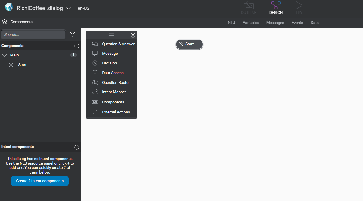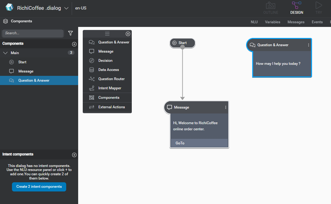 Click on “Create 1 intent component” button. It will create 2 intent components, 1 will be for No Intent and another would be for OrderCoffeeIntent.