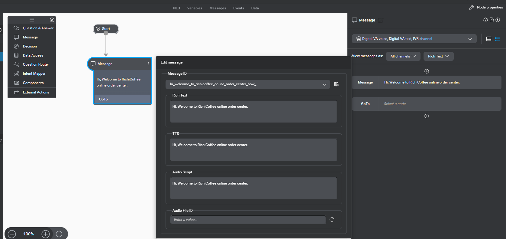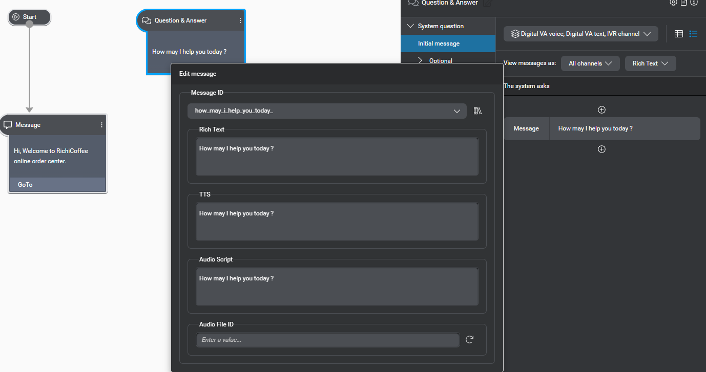 Define the message, by typing “Hi, Welcome to RichiCoffee online order center.” There are 3 options while defining the message.. explained below