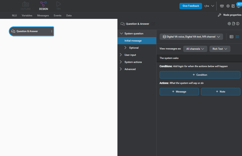 lets design the Q&A component. From the Initial Message as selected above, click on + Message button, and type the message as show below.