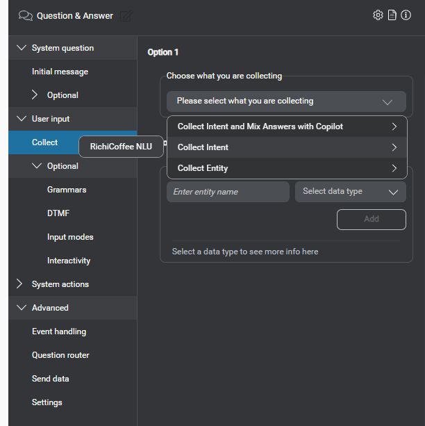 Now click on user Input , and then Collect. You have the option to collect different items here like Entity or Intent. In our case select Intent as show below.