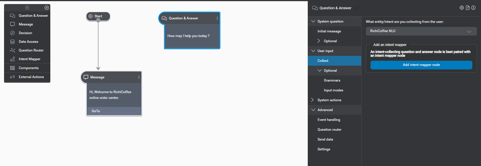 This will add Intent Mapper node. And now click on orderCoffeeIntent as show below