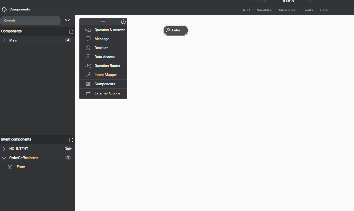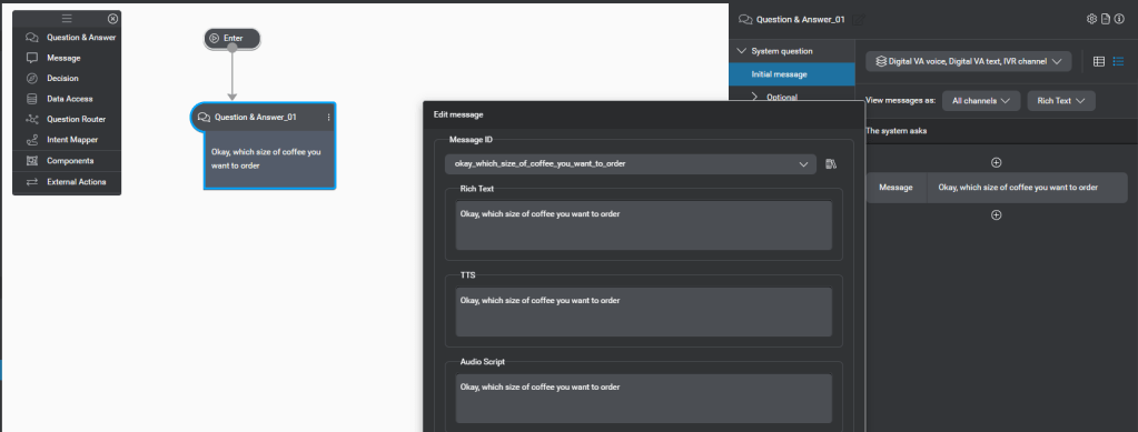 This dialog flow will be designed for order coffee intent. Lets drag a Question and Answer component on Dialog. And we will now as what size of coffee they want to order as shown below.