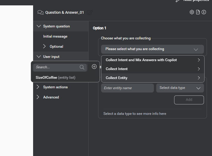 Select the User Input and collect option and select the size of coffee from collect entity option, remember we create an entity in Part 1. So we will collect the user input in the entity.
