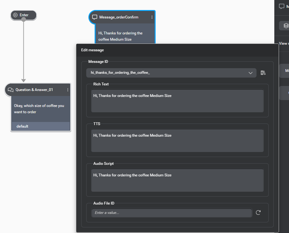 We have defined the confirmation message, lets bind this node so it will be show once user provide the input for coffee size.