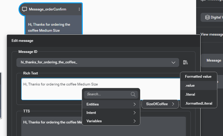Now we have to replace the Medium size which is hard coded in above image to the collected user input in the entity. So for that just simply double click on “Medium” word, and select the .value as shown bellow. Rename the message as Message_orderConfirm.