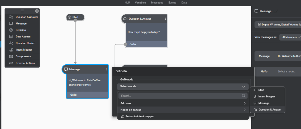 Select the question and answer on the order coffee Intent node, and select Go To and select the existing Node option and click on Message_orderconfirm.