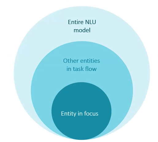 Okay, so how to handle such scenarios. So while designing the NLU model, we have to see, which is our core entity or entity in focus we are capturing or building the bot, and then the outer layer can be other related entities in task flow and then the top layer is the entire NLU model.